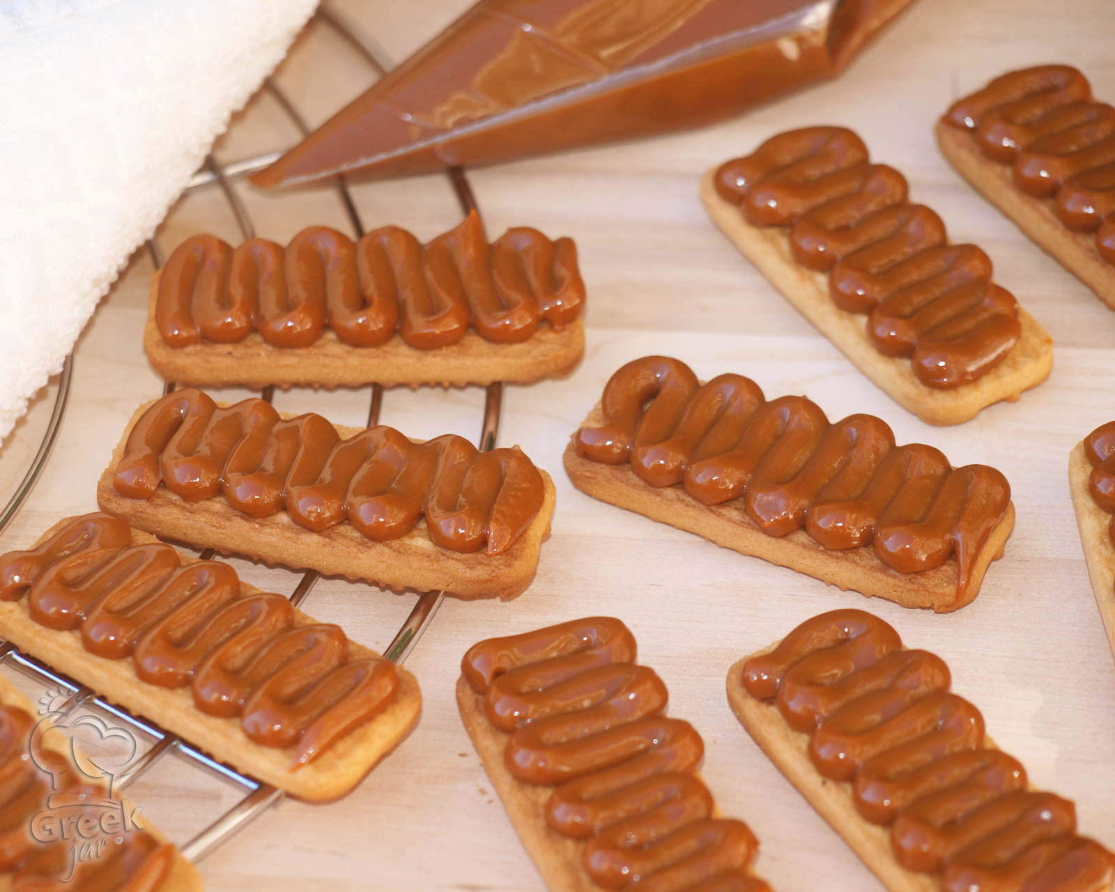 - Pour the sweetened condensed milk caramel over half of the biscuits, using a piping bag.