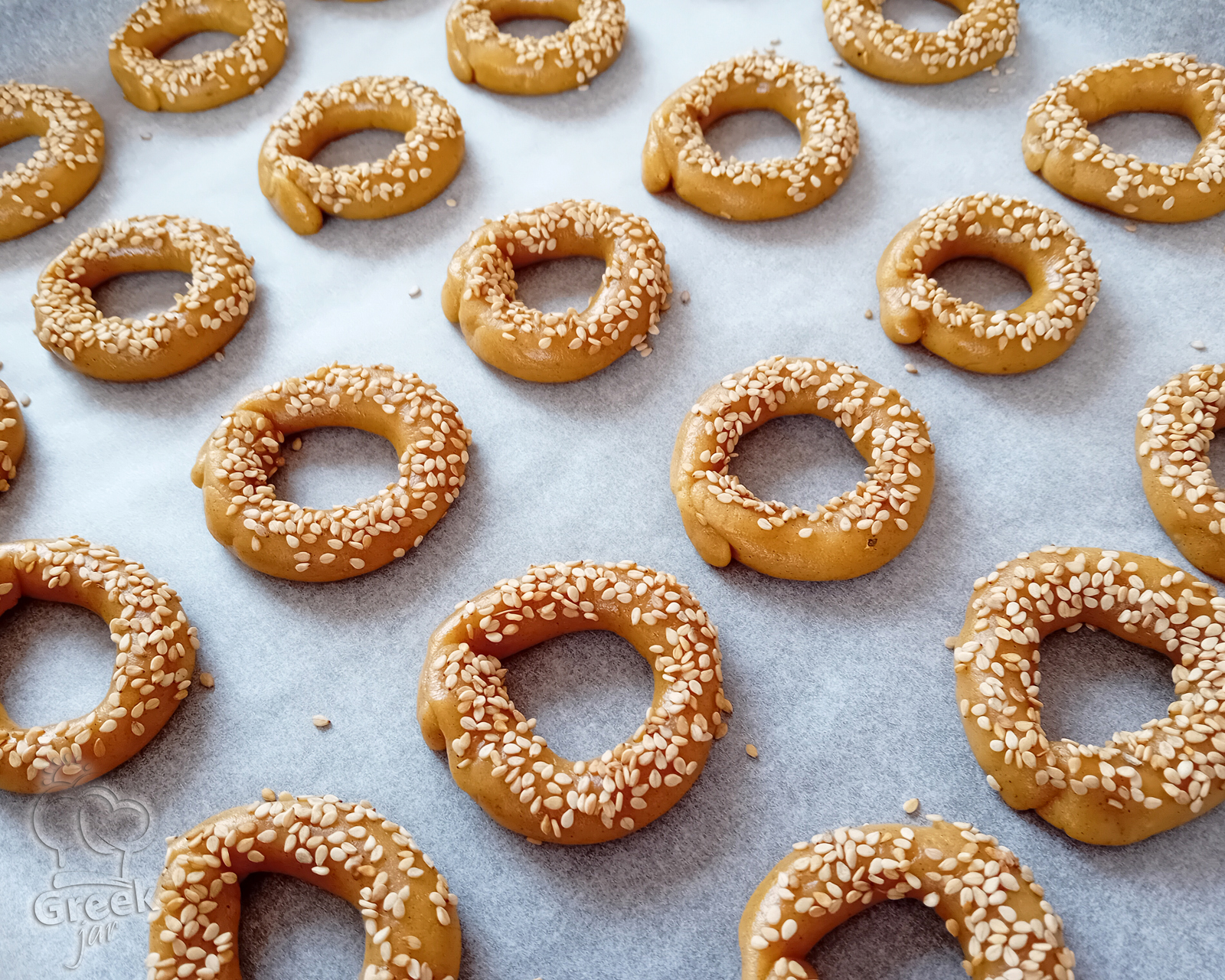- Εάν θέλουμε τα κουλουράκια μας με σουσάμι, βουτάμε τη μία πλευρά τους σε σουσάμι και μεταφέρουμε σε ταψί με λαδόκολλα.