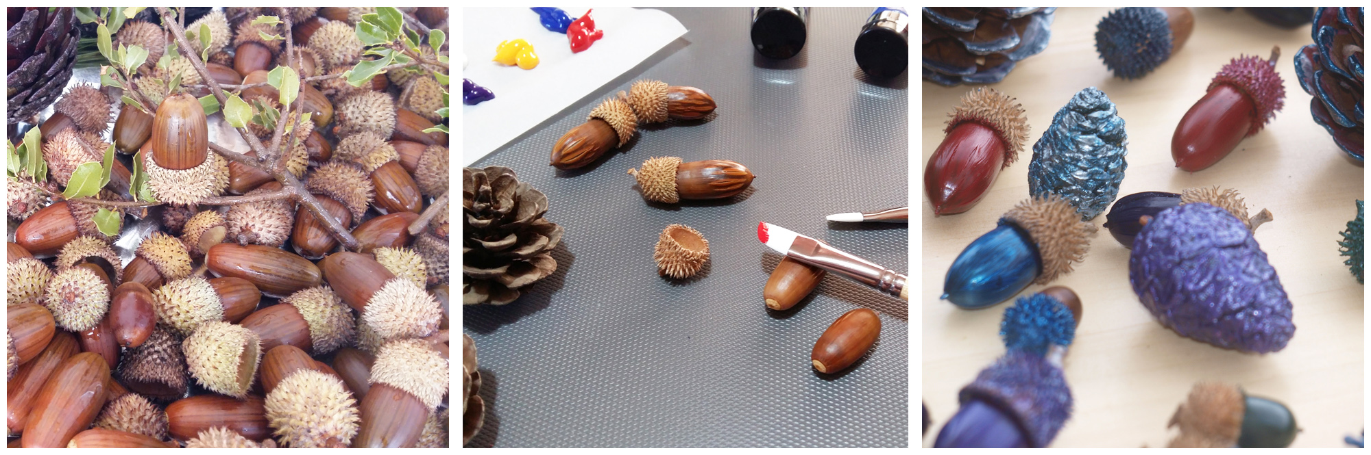 - Use acrylic craft paints and paint brushes to paint your acorns in one color or more creating designs. You can also use a metallic paint spray if you don’t have much time for painting.