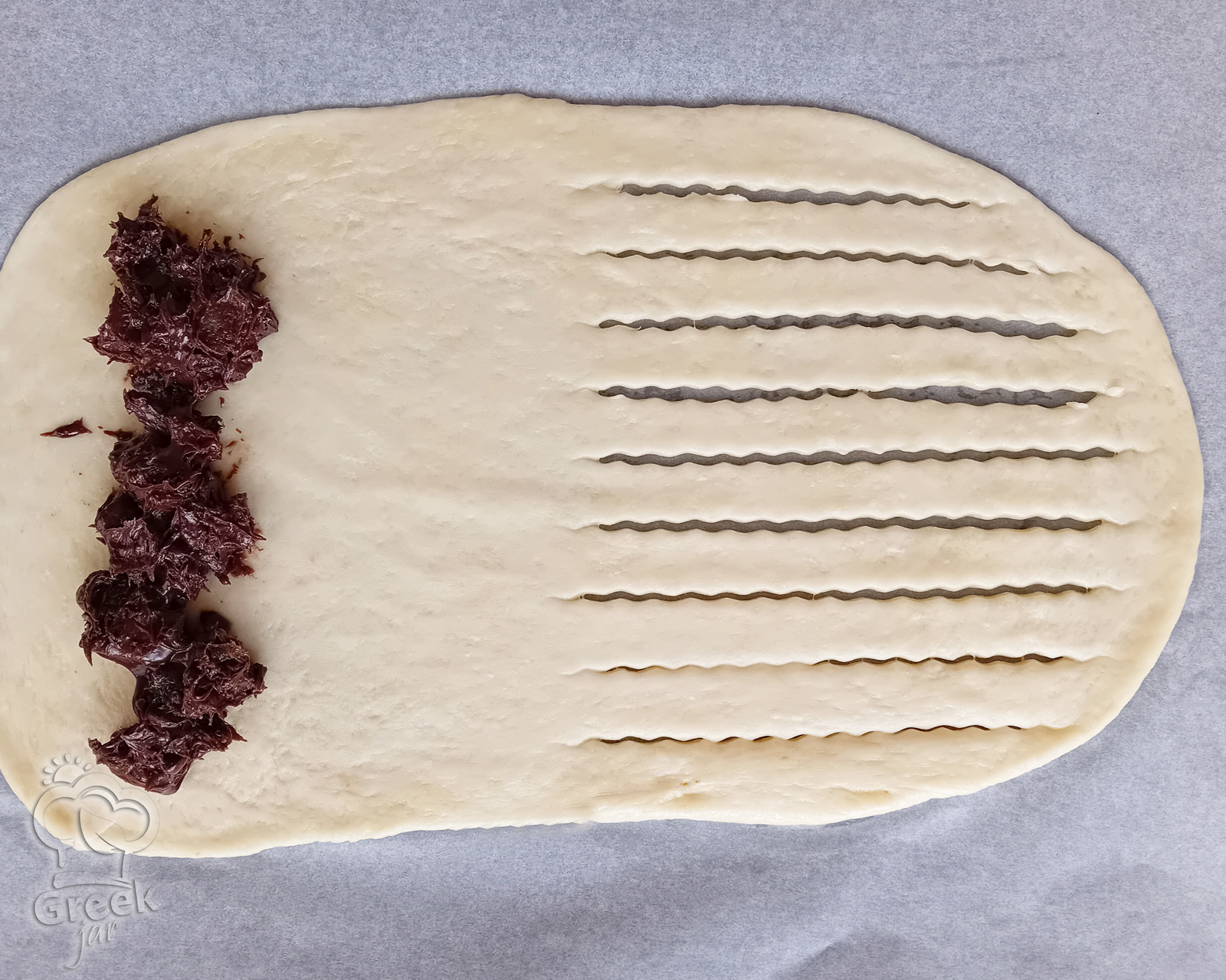 - Using the pizza cutter, cut strips on one side of the sheet, stopping about 2-3 cm from the end of the sheet.