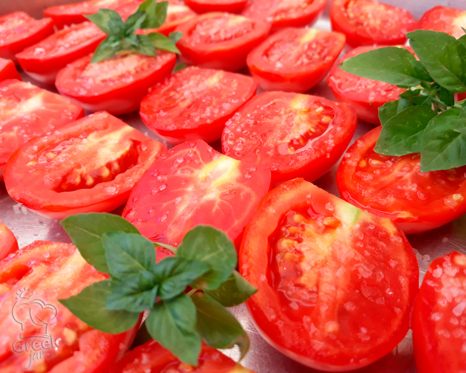 - Slice tomatoes in half.