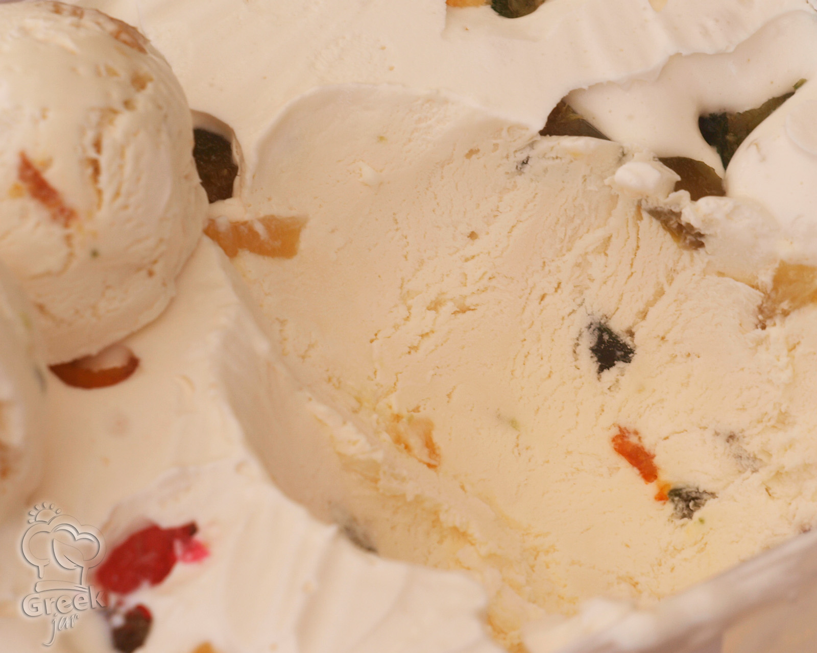 - Pour your mixture, preferably into a stainless steel container, cover and transfer to the freezer for about 5 - 6 hours. The ice cream will be partially thickened. Add the glazed fruits and stir.